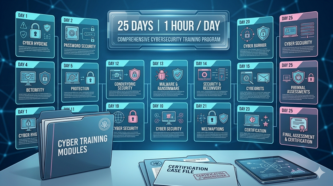 25 Days | 1 Hour / Day A structured, multi-level program covering cyber security fundamentals, threat landscape, networking basics, security controls, and cyber hygiene practices with progressive learning and practical, industry-relevant exposure.