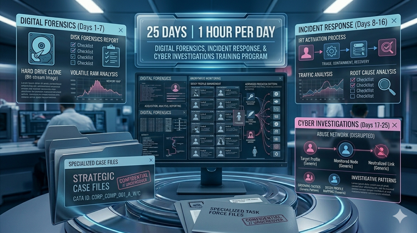 25 Days | 1 Hour per Day Comprehensive professional training in digital forensics, incident response, and cyber investigations, focusing on evidence handling, incident analysis, forensic methodologies, and real-world investigative practices.